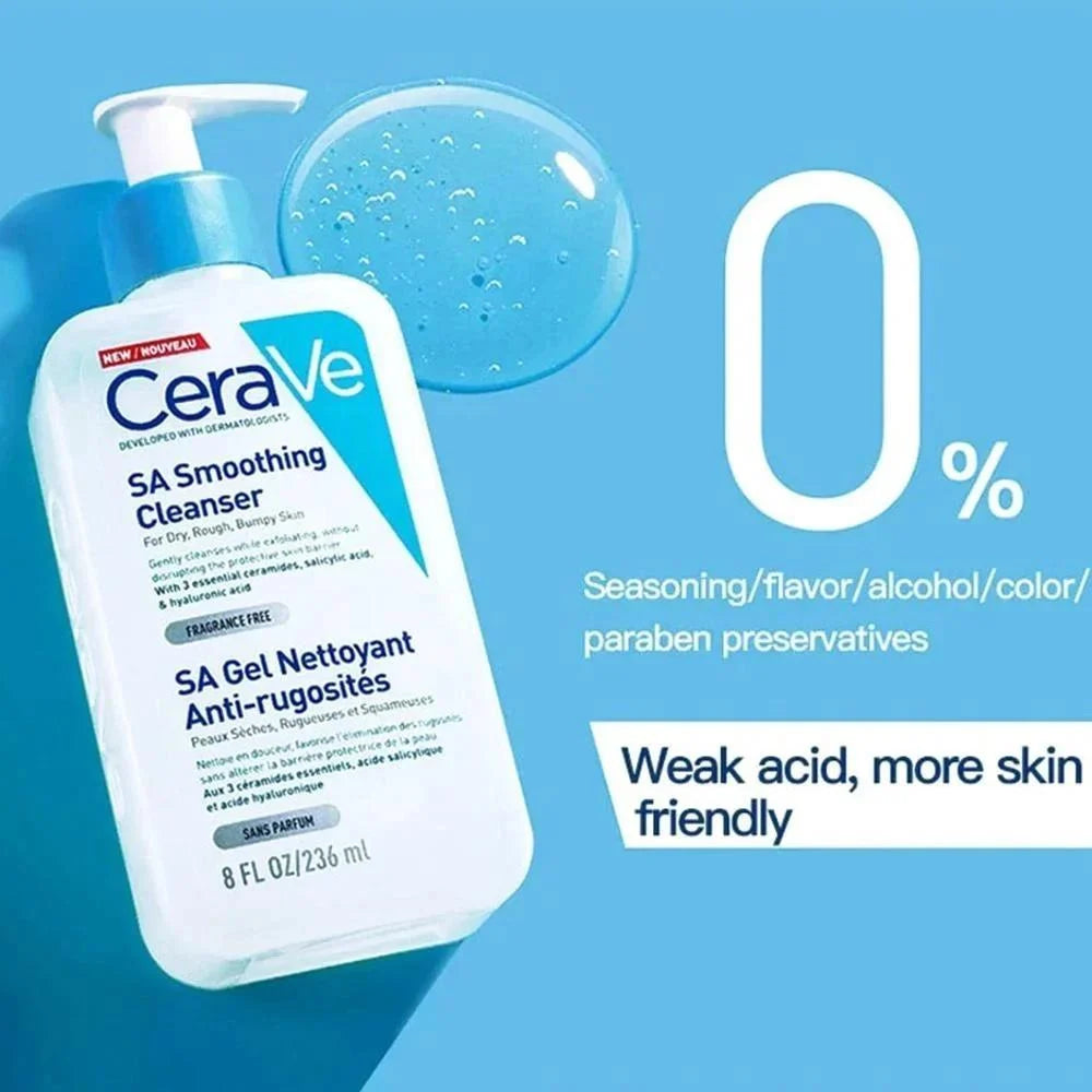 CeraVe SA Smoothing Cleanser With Salicylic acid For Dry & Rough Skin is a salicylic acid-based cleanser fortified with barrier-repairing ingredients like ceramides. A gentle salicylic acid cleanser can help exfoliate and smooth your skin while effectively removing oil and dirt, sloughing away dead cells, and smoothing rough skin-without leaving skin feeling dry. CeraVe SA Smoothing Cleanser provides gentle, non-irritating exfoliation without the use of harsh microbeads. Suitable for use on your face and body as well as acne-prone skin, salicylic acid cleanser not only exfoliates, but contains three essential ceramides, hyaluronic acid and niacinamide, and helps soften and smooth skin without disrupting its protective barrier. This formula is non-comedogenic, fragrance-free, and fortified with antioxidant vitamin D. This cleanser helps to alleviate rough and bumpy skin texture, leaving skin feeling smoother. The salicylic acid in the formula gently exfoliates the skin, without compromising the skin’s natural barrier. As well as hyaluronic acid to hydrate and retain moisture and 3 essential ceramides to moisturize and protect the skin's barrier. This unique combination of ingredients makes CeraVe SA Smoothing Cleanser an effective way to remove oil, dirt and makeup as well as smooth and improve skin texture. Dead skin cells can build up on the skin surface and create dry patches. Salicylic acid is a BHA which helps in exfoliation of this dead skin and also helps to diminish dry patches and improve skin texture. This BHA cleanser can penetrate deeper into pores than AHAs to enable a deep cleanse and remove built up residue. This is developed with dermatologists & it is free of physical exfoliants. All CeraVe products are formulated with three essential ceramides (1, 3, 6-II) to help maintain the skin’s natural barrier. Ceramides are lipids that make up to ̴50% of the skins lipids to form the natural skin barrier. Ceramides are essentially the glue that holds our skin cells together to keep our skin barrier intact and healthy. A healthy skin barrier helps seal in moisture and seal out harmful elements. Lower ceramide levels are linked to skin conditions such as acne, eczema, psoriasis and rosacea. Sun exposure, harsh climates, and age also impact ceramide levels and can compromise your skin barrier function contributing to dry skin. Developed with Dermatologists, CeraVe contains a blend of three essential ceramides that are identical to those found naturally in your skin, helping to replenish your skin's natural lipid levels and restore a healthy skin balance. MVE technology encapsulates ceramides to ensure their continuous delivery to your skin's barrier. By replenishing ceramides where they are most needed, CeraVe helps restore your skin's natural barrier, helping to keep moisture in and harmful elements out. CeraVe has the ceramides your skin needs to help keep you protected. Patented MVE technology that gradually releases the ceramide-enriched formula over an extended period of time. MVE is like a sphere with a series of layers that slowly dissolves, releasing the ingredients into your skin. The product continues to work after it is applied, hydrating your skin all day in just one use.