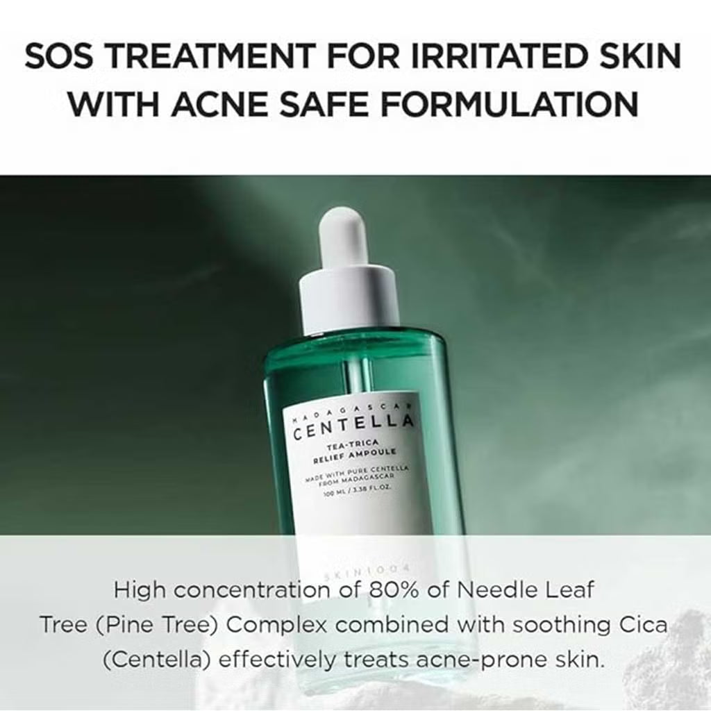 Skin1004 Madagascar Centella Tea-Trica Relief Ampoule is a soothing formula especially formulated for acne prone and sensitive skin to immediately soothe & calm irritated and inflamed skin and provide comfort all day long. Enriched with Skin1004’s signature natural ingredient Centella Asiatica extract with triple Cica care complex along with 80% needle leaf extract (Pine tree complex). Furthermore, it also contains anti-sebum P complex to control excess sebum and oil production, tightens the enlarged pores and improves the skin texture. Centella asiatica, also known as Gotu kola, is a plant-based ingredient that has gained popularity in the skincare industry due to its soothing and hydrating properties. It can help soothe irritated and red skin, making it beneficial for individuals with sensitive or easily irritated skin. It might be especially useful for those dealing with skin conditions like acne, where inflammation and redness are common. It soothes irritated skin and helps strengthen skin barriers. Skin1004 Madagascar Centella Tea-Trica Relief Ampoule is a light liquid immediately absorbs into the skin and non-sticky formula leaves skin refreshed and moisture. It’s a vegan and cruelty free formula, and all ingredients are EWG green grade and do not contain any artificial fragrance. This non-comedogenic formula is made especially for sensitive and acne prone skin. Skin1004’s signature ingredient, Centella asiatica preserved for 200 million years from Madagascar, containing the purity of the untouched nature.